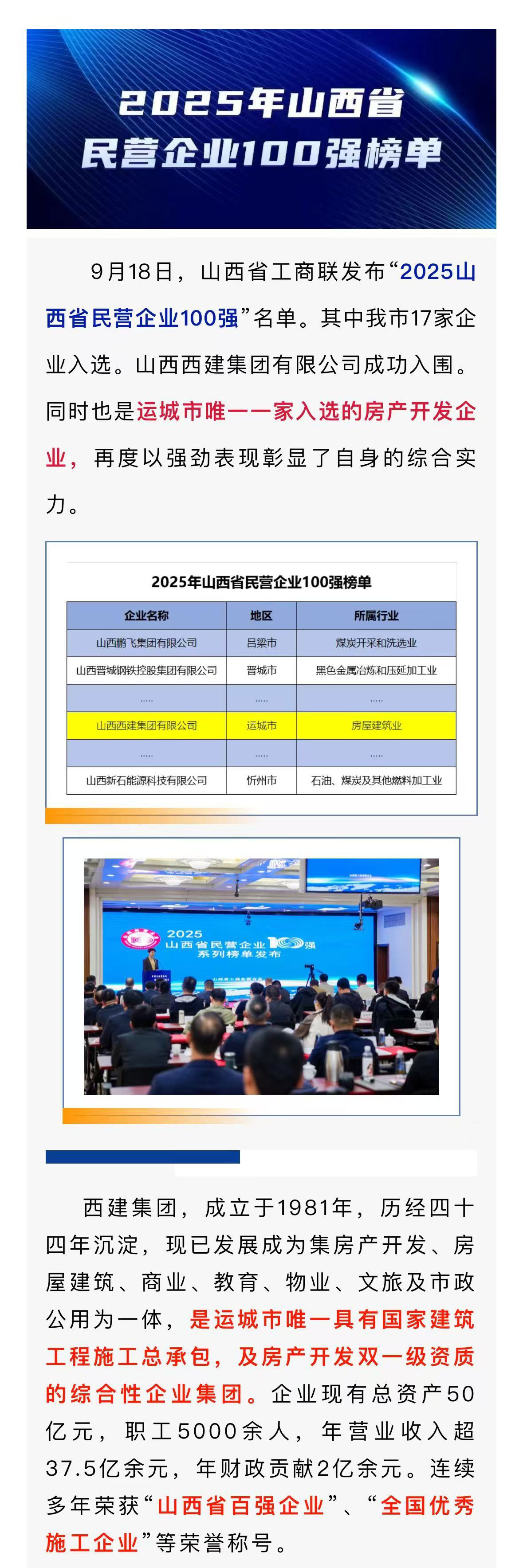 喜報!西建集團(tuán)再次榮登“ 2025 年山西省民營企業(yè) 100 強(qiáng)”